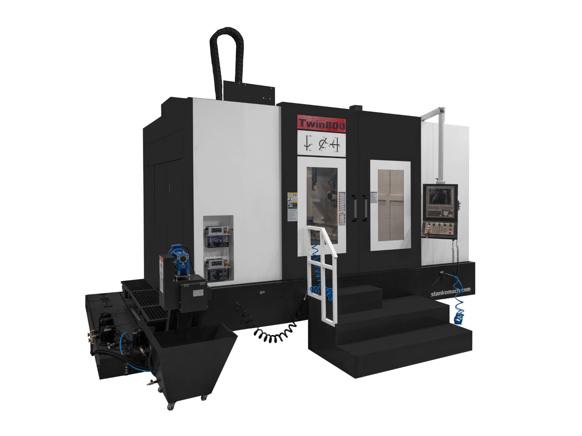 22500 кгГоризонтально-вертикальный обрабатывающий центр TWIN 800 позволяют за одну установку заготовки на полноповоротном столе производить комплексную обработку инструментами установленными как в горизонтальном, так и в вертикальном шпинделях не только с пяти сторон, но и поверхностей с круговым формообразованием. Эта уникальная возможность позволяет изготавливать высокоточные изделия самых сложных конфигураций.